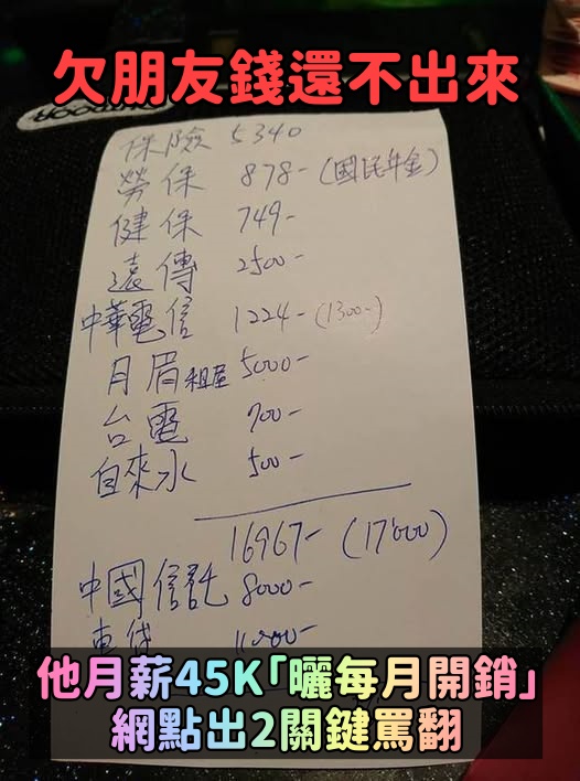 欠錢還不出來!他月薪45K「嘆錢完全不夠花」 曬出每月開銷明細「網看出2關鍵罵翻」
