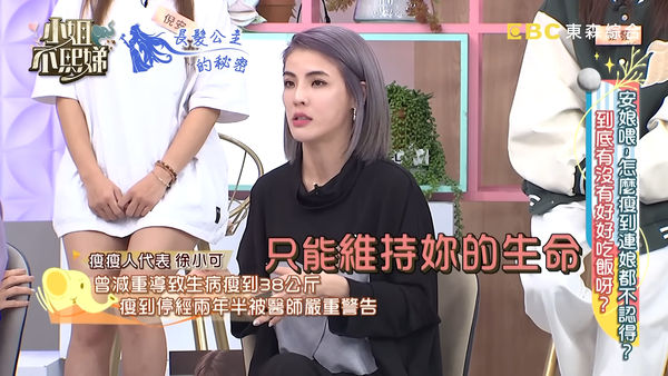 以前靠著節食減肥,不料瘦下來連經期也停了,當時停經2年半,徐小可透露自己一開始可開心了,覺得自己很省衛生棉,看著周遭女生為經期痛苦,她卻可以360天去游泳,體會到自在的快樂。但這份快樂維持不久,某天開始身體出現異狀,發現自己不斷掉頭髮、頭暈,手上的血管也變得很明顯,崩潰表示:「我就覺得不太對勁,然後那時候就用了很多種方式,完全沒有辦法。」試過催精針、中藥、吃催精藥,都沒有用!