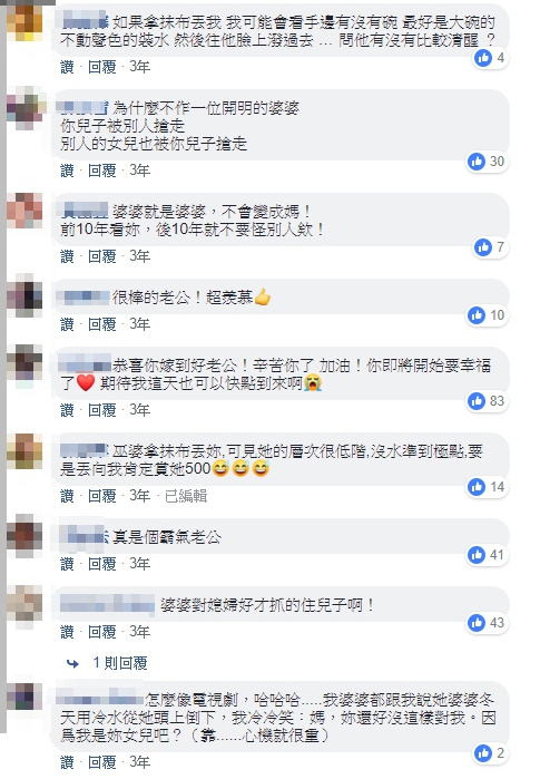 原PO的故事雖然是在2015年上傳的舊文章,但最近又被網友翻出來,許多人看完紛紛讚爆,「有這麼棒的老公,婆婆再怎麼靠杯都不怕」、「有些家庭媳婦真的比外勞還不如,很替妳高興有個體貼妳的先生,真讚!」、「幸好妳忍了下來,妳老公都看在眼裡,恭喜妳脫離那個巫婆」、「應該把那抹布拿去塞婆婆那張爛嘴!」