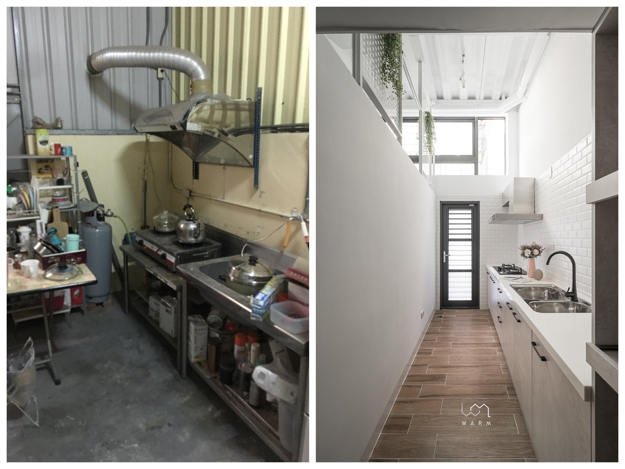 樓梯後方直接通往廚房,原本的廚房十分傳統簡陋,抽油煙機、瓦斯爐和水管線路都直接暴露出來,空間看來雜亂無章、缺少收納空間,感覺在這樣的廚房裡煮飯真的很辛苦呀~設計團隊首先將大片鐵皮卸下引進明亮採光,並透過水泥外觀飾板和白色磁磚打造工業風氛圍,質感瞬間提升許多!