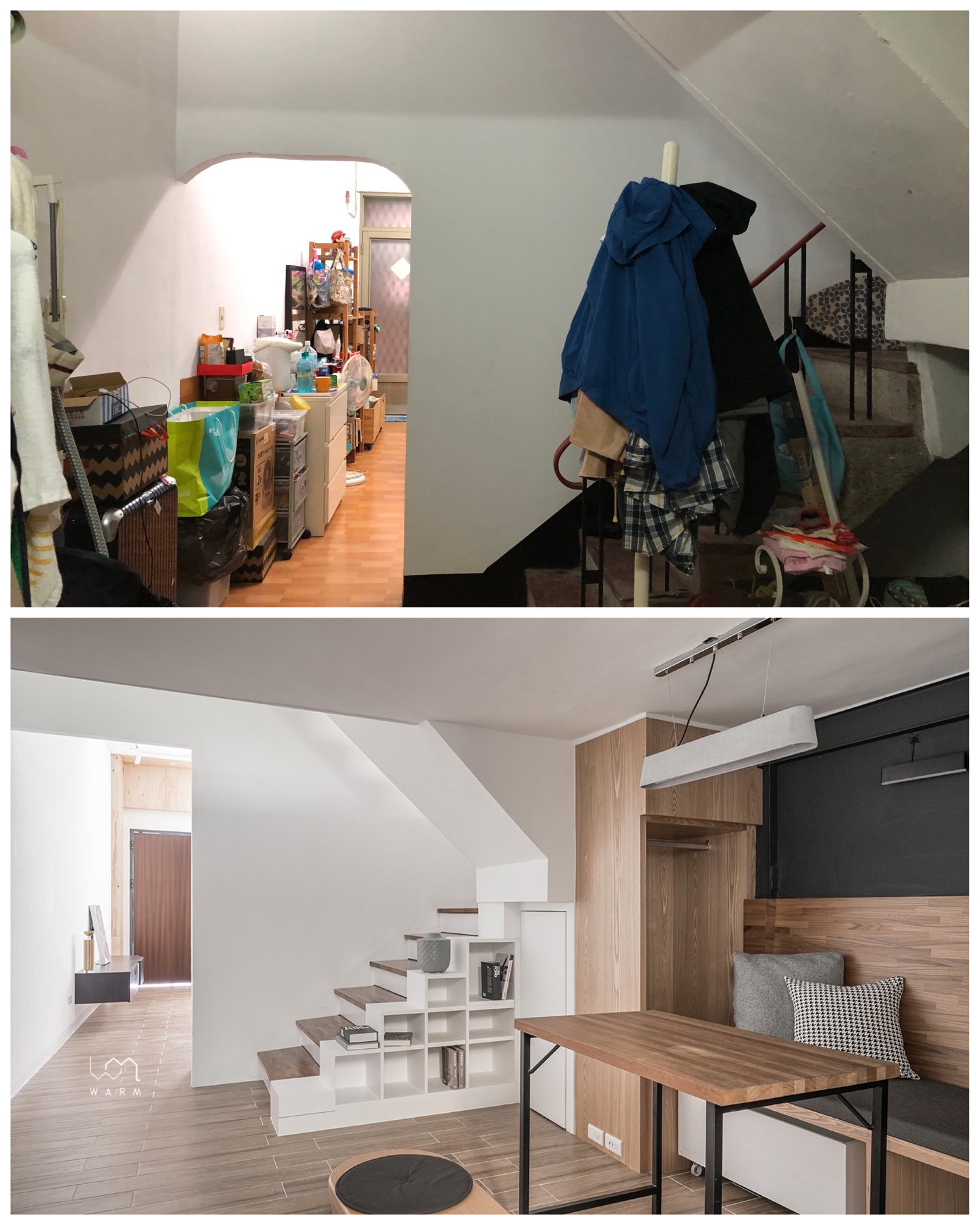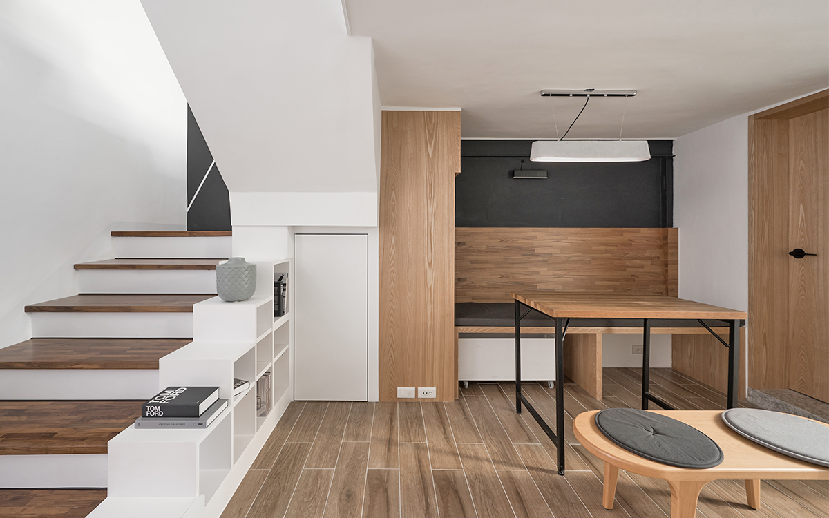 小小廚房雖然空間依舊不大,但增加了不少收納空間,鍋碗瓢盆終於有了自己的家,管線也都巧妙隱藏了起來,開放式的挑高設計更讓視覺效果更加延展!