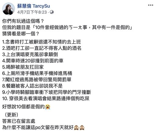 過了一陣子後,她才公布答案,表示第6項是假的,其他都真實發生過,讓她直呼「先讓我尖叫一下...啊~為了讓大家輕鬆一下,我犧牲大了,真面目若是被誰看見,我不介意它幻滅,欣賞自己的不完美,請自己接唱下一個」,但讓網友驚訝她竟然曾進過警察局,掀起一陣討論。