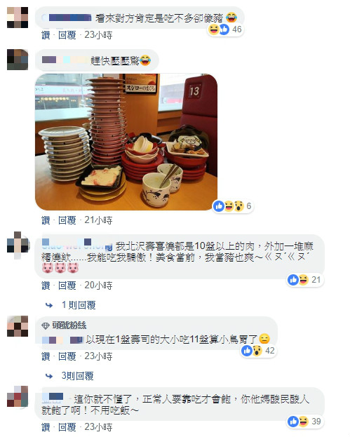 有網友認為應該是男生的女友在吃醋,原PO也回應或許有這可能,因為男生一直盯著她看,其他人則是留言「說人家吃多真的很失禮,這男女都一樣,男的一直盯人用餐失禮,女的更糟還說這麼難聽」、「非常好的回答」、「一個人吃過34盤」、「5分鐘吃11盤真的很快」、「對咩,花自己的錢愛怎麼吃就怎麼吃,管很寬耶」,有人問原PO要吃幾盤才會覺得飽,原PO也大方的說「3、40盤」,其實能吃就是福阿~~何必要去管別人要怎麼吃呢,又不是住在海邊........