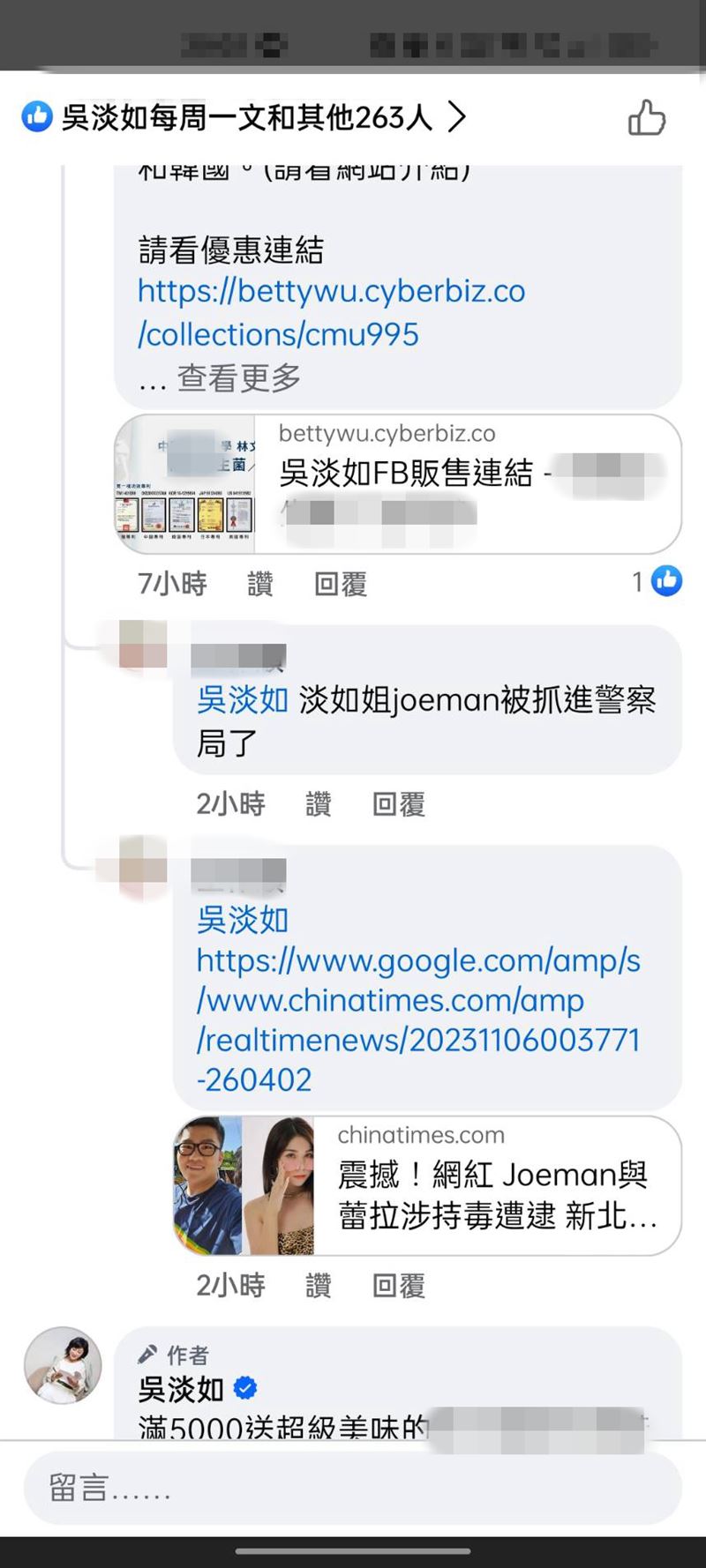 隨著Joeman陷入非法品風波,不少網友昨天也在吳淡如的臉書留言,狂cue「淡如姐Joeman被抓進警察局了」。對此,吳淡如當時人在中國念書,臉書動態佈滿小編業配的貼文,而提到Joeman的回文已悄悄被消失,這樣的狀況,也引發討論。