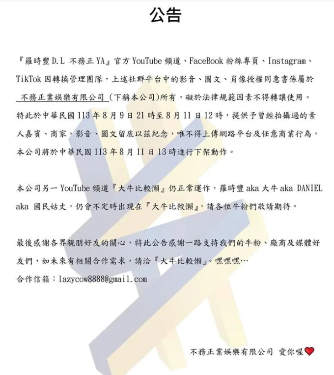 羅時豐無預警發出聲明,表示因轉換管理團隊,原本頻道《羅時豐DL.不務正Ya》的影片會全面下架,消息一出不僅觀眾錯愕不已,頻道製作人姪子張敏慎表示自己也是同一時間得知這個消息,對此有許多合作店家們力挺張敏慎,暖心喊話:「挺你到底!加油」、「你的優秀不能被埋沒,你的善良不能被掩蓋,你的努力我們都看見了!」讓張敏慎看了忍不住哭出來!