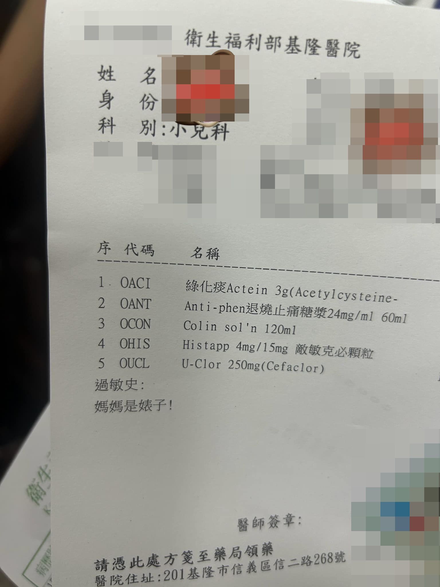 會不會太誇張!一位媽媽日前在臉書社團「爆怨2公社」發文表示,她在24日帶著6歲大的兒子去衛生福利部基隆醫院就醫,結束看診後拿著藥單要去領藥,沒想到仔細一看竟發現過敏史旁竟寫著「媽媽是婊子!」,讓她當場傻眼,也表示自己沒有跟醫護人員吵架過,「護理師也很納悶、也有跟我說對不起」
