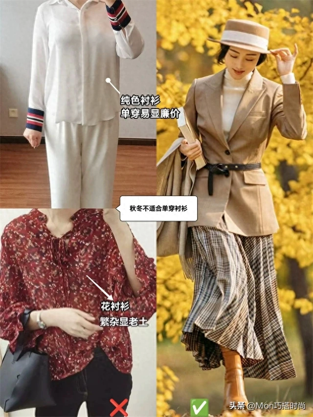 襯衫則是犯了「美貌三要素」中——質感和配色的忌。純色襯衫易顯廉價單調,花色、尤其是彩色印花襯衫更是繁雜顯老第一名!