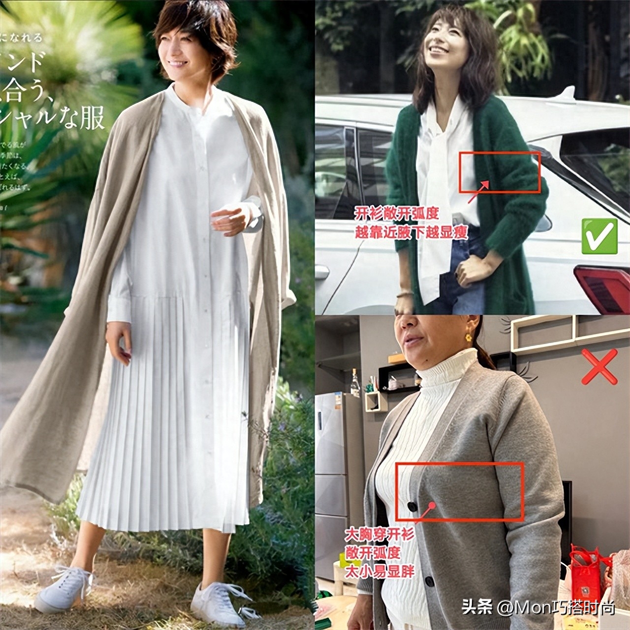 基礎色和低飽和純色的長開衫隨便挑。若大胸穿質地軟的長開衫,開衫敞開的弧度越靠近腋下越顯瘦,敞開弧度太小則易顯得虎背熊腰喲~