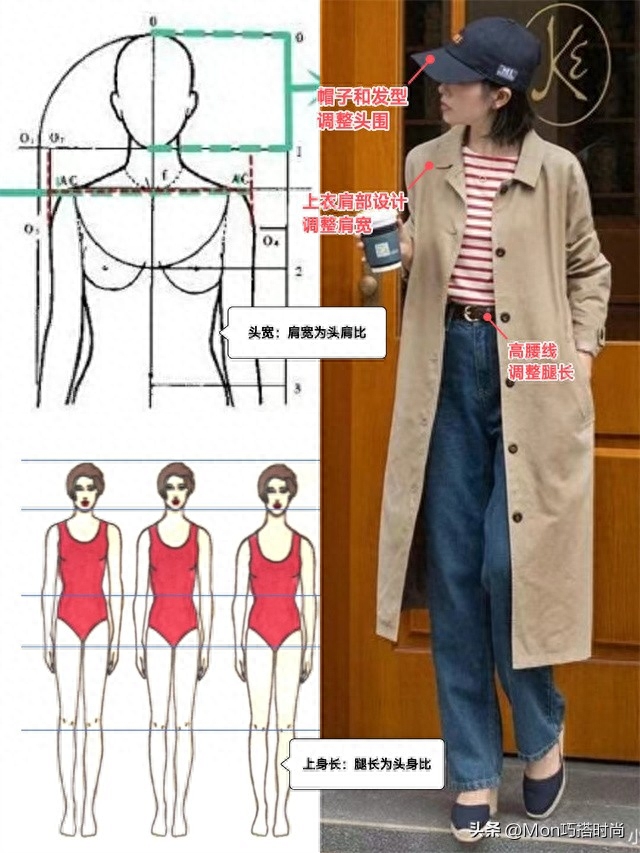 當然,比例也是決定形體美的一部分。大齡女性穿衣時需調整的比例主要有頭肩比和頭身比。頭寬:肩寬接近1:2,腿長佔比接近0.618是理想比例。