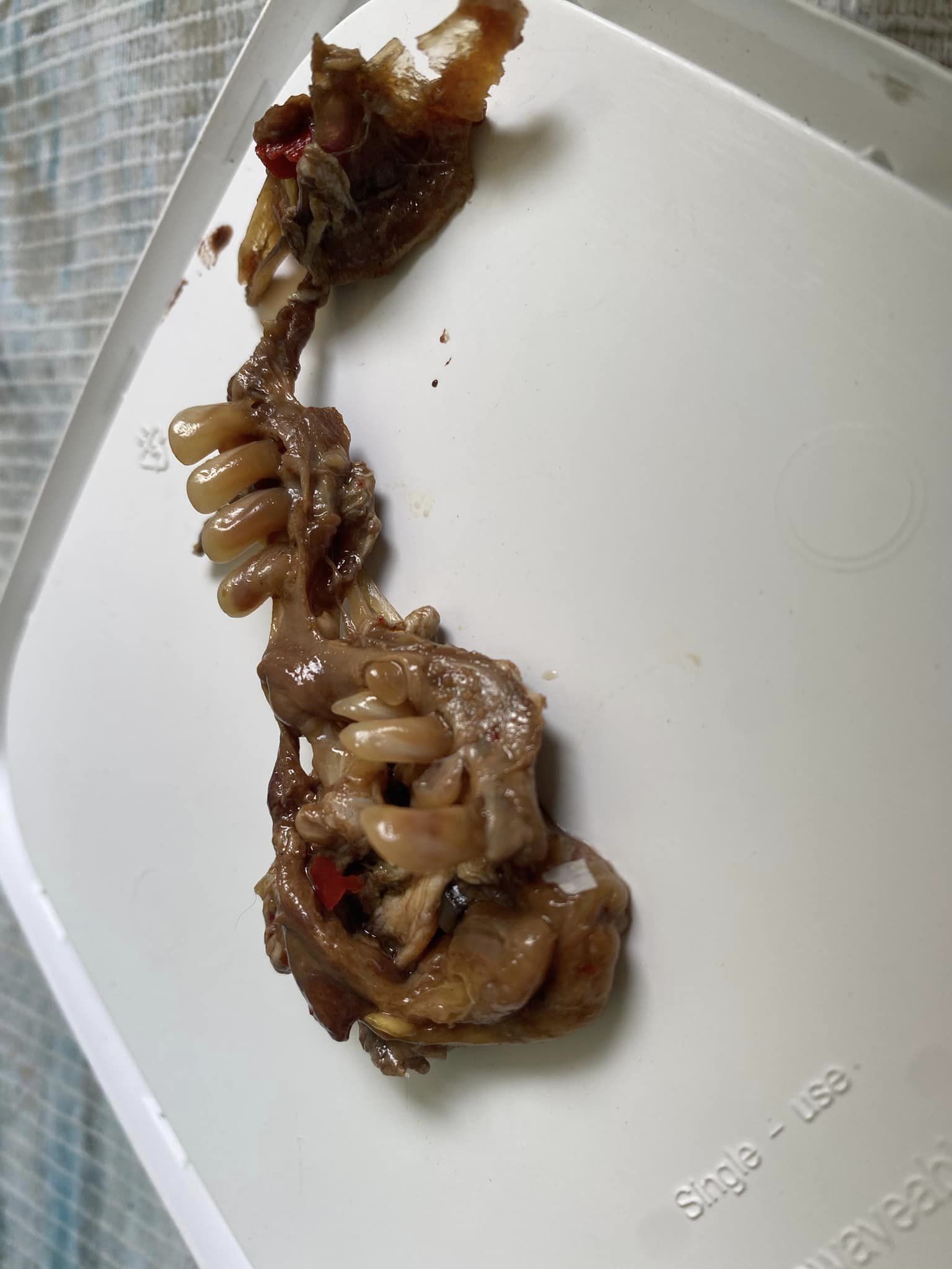 這個詭異發現讓女子瞬間反胃作嘔,她在貼文中懊惱地表示:「這到底是什麼東西的骨頭?我還要吐多少次才能把胃裡的沙拉全吐光?」雖然她試圖說服自己可能是發酵魚的骨頭,但一想到魚類通常不會有這種牙齒,就更加困惑且恐慌。為了解開謎團,她將「帶牙骨頭」的照片分享到網路上,但這次的用餐經驗已經讓她對最愛的發酵魚青木瓜沙拉徹底失去食慾。