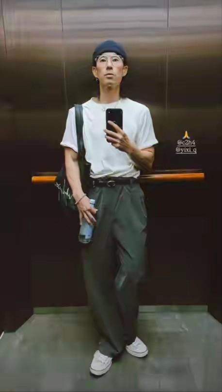 照片裡,他戴個深藍色瓜皮帽,配細邊大框眼鏡,耳朵上釘著細耳飾,穿件鬆鬆垮垮的白T恤,揹個單肩包,下身是闊腿休閒褲,腳踩帆布鞋,整個街頭休閒風,看起來蠻輕鬆時尚。