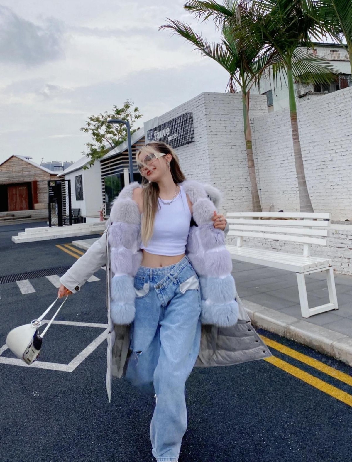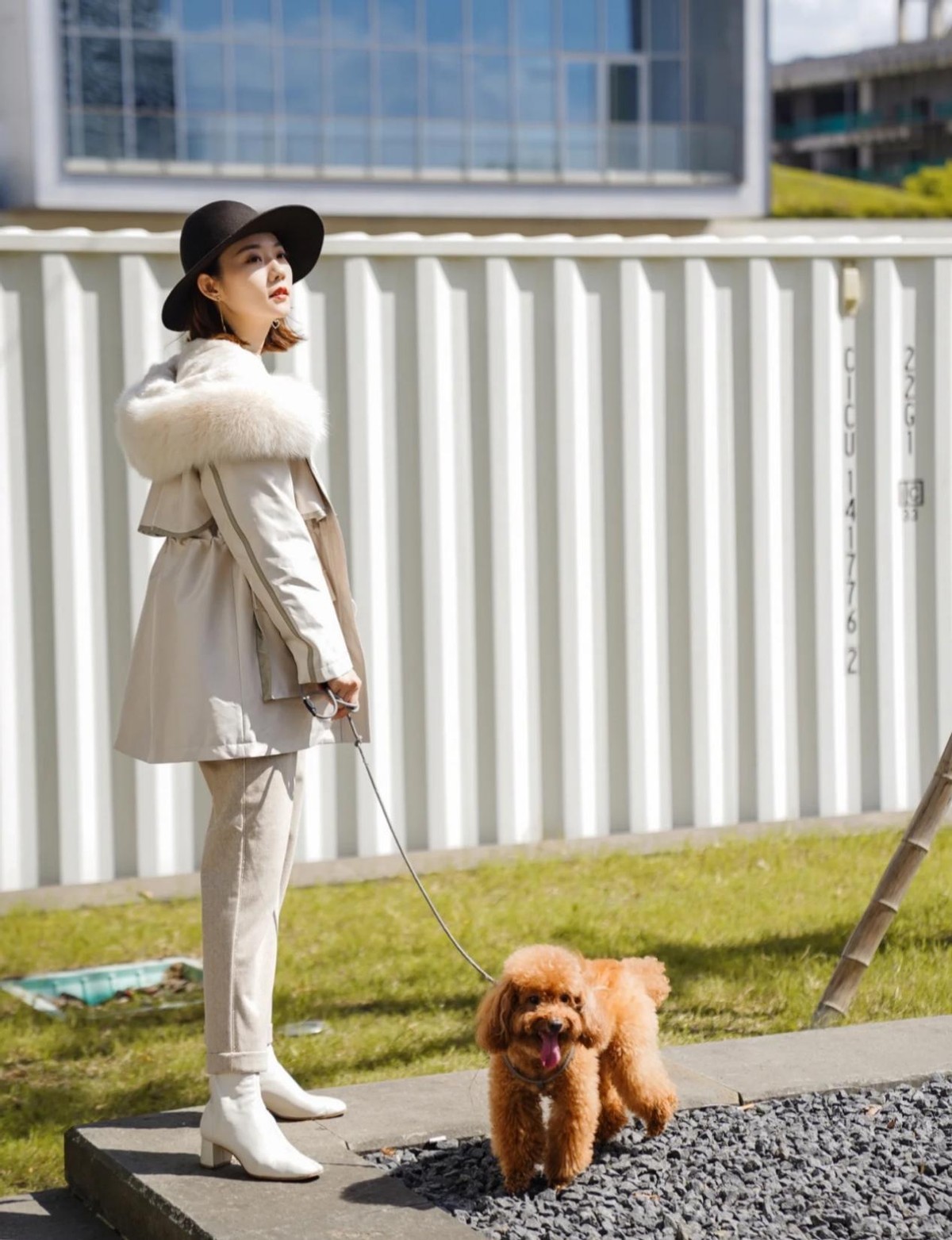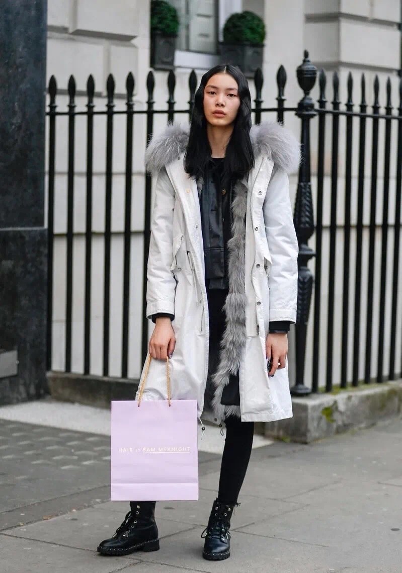 鑒於派克服比起一般的外套是比較龐大的,尤其是加了毛毛領之後,側面看過去體積稍大,小白褲建議選擇褲腳微微收攏的版型,錐形褲等就很合適,褲腳再卷個邊,搭配同色的靴子,顯瘦又洋氣。