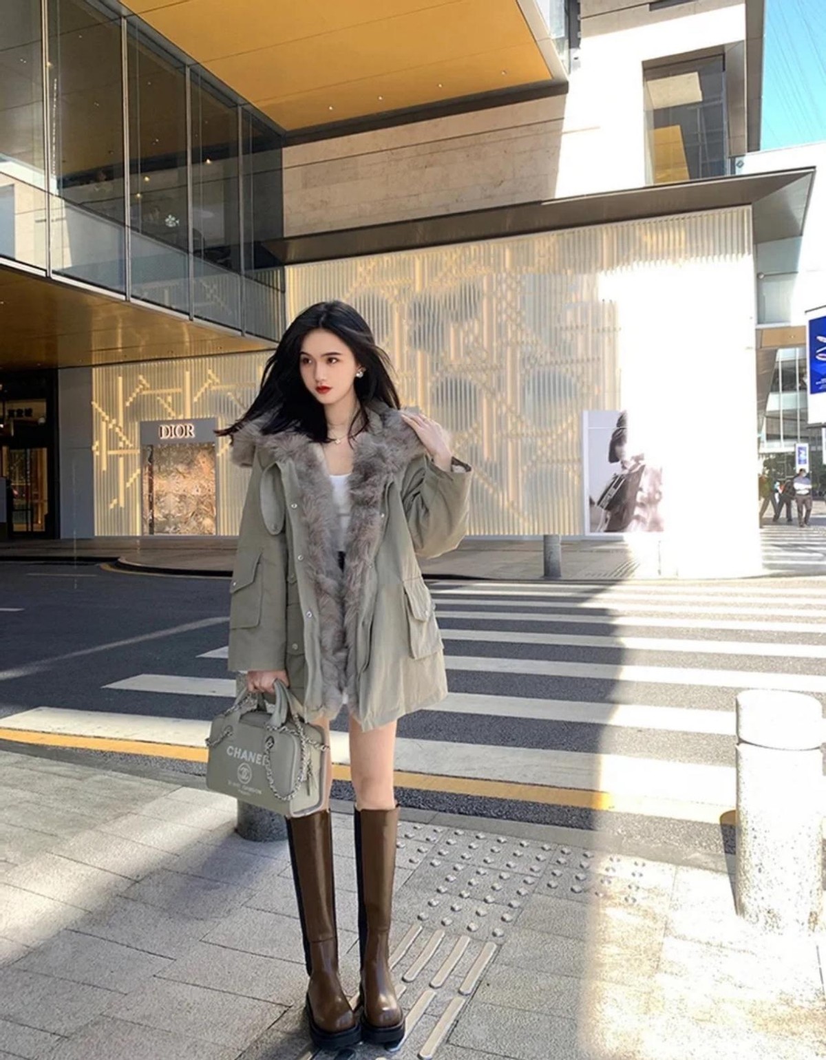 且派克服的長度基本上比一般的短外套要長,短的派克服也會蓋住胯部,再搭配長過膝蓋的靴子,只露出腿部的一截肌膚,不至於感覺到寒冷。