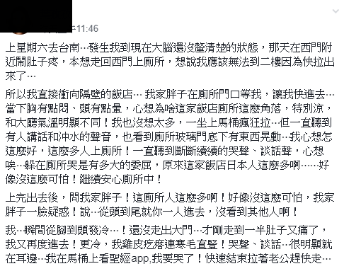 老公一聽到網友這樣講,馬上臉色一沉,冷冷地說︰「從頭到尾就你一人進去,沒看到其它人啊!」讓她當下從頭毛到腳,只想趕快離開這間飯店。
