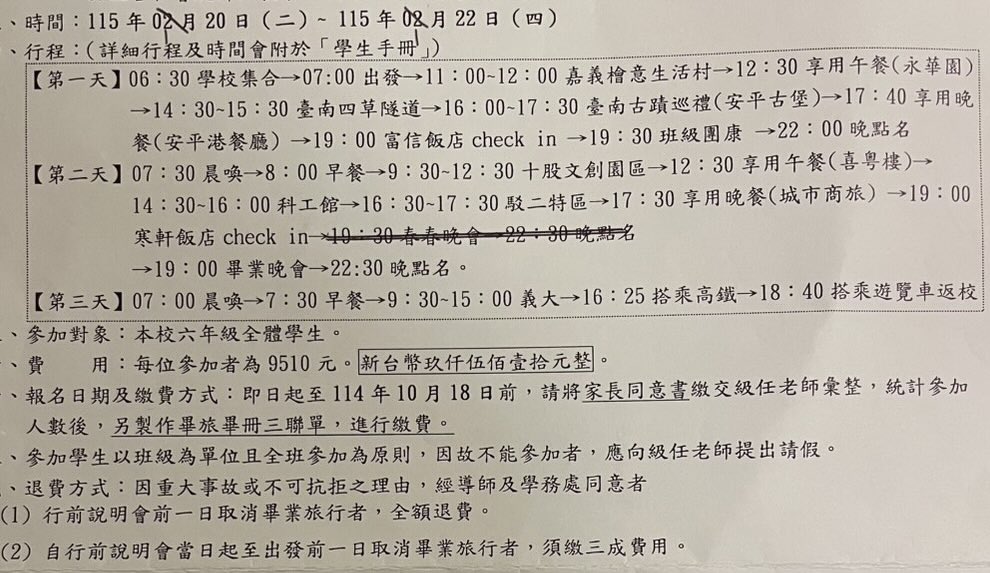 小六畢旅「要價9510元」家長嚇壞!3天2夜「完整行程表曝光」網傻:貴又爛