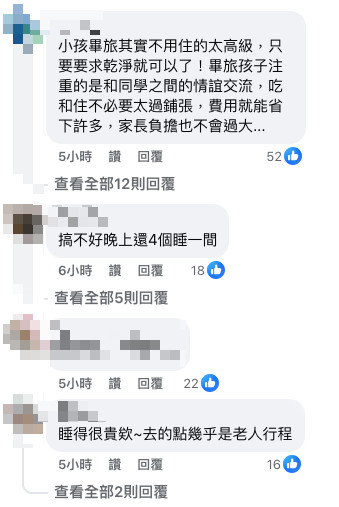 不少網友對這樣的行程安排提出質疑,認為景點選擇過於老氣,且多為免費或低價景點,「義大後搭高鐵還要搭遊覽車?超級浪費時間跟錢」、「小孩畢旅其實不用住的太高級,只要要求乾淨就可以了!畢旅孩子注重的是和同學之間的情誼交流,吃和住不必要太過鋪張,費用就能省下許多,家長負擔也不會過大」、「可以去香港」、「我們兩天才4460元,你們3天9千多太貴了」。