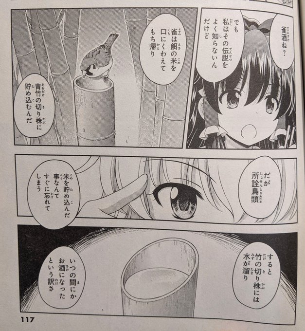 另外也有網友表示漫畫《東方三月精》曾提到類似的內容,『麻雀之類的小鳥會將竹子當作米倉,把米一粒一粒地儲藏在裡面,但過了一段時間麻雀自己也忘了這事,竹子裡的米就發酵變成酒了。』