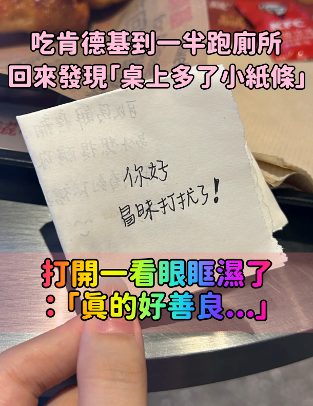 去完餐廳廁所!她發現「桌上多了小紙條」 旁邊還「放了兩條柱狀物」:眼眶瞬間濕濕的 Sabrina 2024-07-15 檢舉 網友看到後也紛紛回覆表示:「真的會因為一件事開心一整天 」、「善良的女孩子是這個世界上最可愛的存在」、「我直接丟一片姨媽巾給你」、「天使降臨人間」、「真的會很感動的」、「好善良的女生啊救命」、「好溫柔好暖心的女孩子」、「給她送份雞米花吧」(示意圖/圖片來源:搜狐)真的好善良~~希望世界上有更多這樣溫柔的路人!來源:小紅書@鮮晨多 Advertisements 回首頁 2/2 Advertisements 猜你會喜歡 自爆圈內大哥騙錢!陳為民怒控「130萬存款遭盜領光」信任換絕情 「從此1招拒借錢」心酸卻超有用 女子好心把房子「借給同事10年」 想收回房子時「同事卻拒絕搬走」還烙下一句話 陳美鳳歡慶68歲生日「神秘帥男驚喜現身」!她甜喊「我的小太陽」洩兩人關係 編輯精選推薦 More + 婚變尪落跑!單親媽「獨扛千萬債養孩」到處躲黑道 「一開口驚艷眾人」熬成台灣歌后 22歲愛女病逝!資深男星「走不出喪女痛」留白長髮現身 掛骨灰項鍊「代女做1事」惹淚 65歲男星獨居暴斃!大咖女星放下恩怨「送前夫最後一程」 昔遭動手6年嘆「死者為大」 離婚11年!洪榮宏愛女結婚「終破冰前妻」 「2爸爸牽她進場」催淚畫面曝 「女兒們,對不起!」44歲媽媽選擇「遠赴瑞士安樂死」 臨走前「向女兒們最後訣別」惹哭無數網友... 臨時找不到保母!女學生硬著頭皮「帶寶寶去大學上課」 教授霸氣伸手「寶寶我來抱吧」畫面超溫馨 淚奪金鐘最佳主持!小S感謝大S「但獎座沒要獻給妳」 哽咽「講出真心話」全場淚崩 為什麼「失去毛小孩」會撕心裂肺?科學家「給2大原因」:就像失去小孩... 賜福遶境!白沙屯媽祖2度衝「吊車大王豪宅」 首度爬樓梯「信徒驚見一幕」:善行感動天 退休4年了!76歲張小燕驚爆「健康亮紅燈」 罕見現身聚會「真實狀況全說了」 最新/賈靜雯深夜慟曝「她已離世」 淚PO合照喊:真的好愛你... 當年親吻1歲嬰!42年後「對方竟成巨星」同框劉德華 「超高顏值如兄弟」粉絲喊:真的差19歲? 台語歌后慟別摯愛!告別式上認「早隱瞞病情」 道歉哭喊:原諒我簽放棄急救 重量級禮物來了!劉品言「挺8個月巨肚」為媽媽慶生 鬆口「第一胎性別」網嗨翻:猜對了 當一個女人身上沒有手鐲、手鍊、也沒有項鍊!代表她「在3個地方」一定非常特別 被當鞋子丟棄!45歲知名女星「閃嫁百億豪門」 生日當天「一家合照有亮點」網淚:終於得到幸福 趕在40歲前閃婚!八點檔女星「宣布嫁給他」 尪驚人身分曝「媒人是柯叔元」 婆婆每天跟老公要1000塊「轉頭就偷塞給我」! 直到「老公一次員工旅遊」真相讓我淚崩:婆婆真把我當女兒 晚年隱居台東!68歲名主持失蹤「車內身亡」 伴侶悲曝「死前做1事」:還掛念著我 交往7個月就閃婚!小17歲妻遭質疑「嫁沈玉琳是為了錢」 婚後負債3千萬「芽芽一句話」網看哭 粉絲太熱情!36歲女神被包圍「意外遭粉絲戳臉」 下秒「高EQ寵粉舉動」網狂讚:細節見人品❤️ 以為只是小感冒!本土女星悲痛證實「他併發肺炎過世」 一度淚灑現場「後悔同意插管」 金鐘獎/抱走綜藝節目主持人獎!小S掩面痛哭「向天上大S喊話」全場落淚 晚年兒孫滿堂!73歲影壇大哥「拄拐杖現身」腳步蹣跚 兒子「全程攙扶不喊累」網羨:又帥又孝順 謝忻美國「披台灣國旗」崩潰大哭!點名他「痛罵變態」:每個禮拜死好幾次